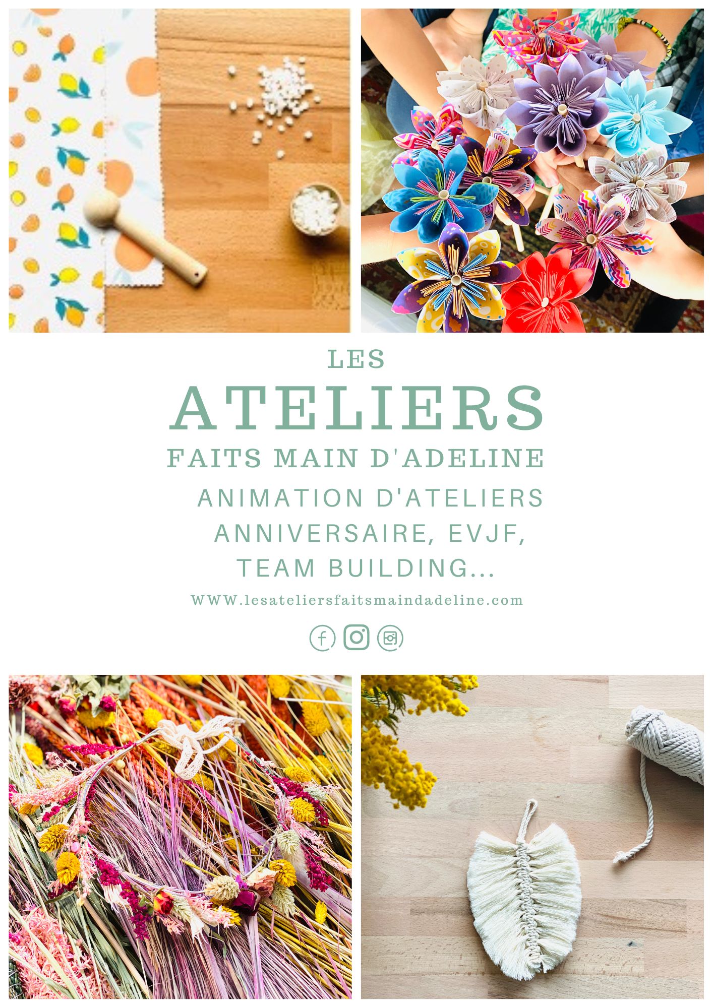 Les ateliers faits main d'Adeline, ce sont des ateliers créatifs divers et variés. C'est l'occasion de vous servir de vos talents d'artiste pour créer votre propre décoration personnalisée. Que vous soyez débutants ou plus expérimentés, Adeline saura vous aiguiller pour réaliser de véritables œuvres d'art ! Tout le monde y est le bienvenu : enfants, adultes, futures maman... Des ateliers parents/adultes sont également au programme !Créez vos bijoux, décorations maison, ou customisez des objets ! Tous les goûts y sont ! Les ateliers durent entre 1H30 et 2H et doivent obligatoirement faire l'objet d'une réservation. Selon l'atelier, le prix varie entre 25 et 45 euros.Vous pouvez y participer en petits groupes, en cours particuliers mais également y réaliser vos événements publics ou privés. Adeline se déplace désormais exclusivement à domicile ou dans les entreprises/collectivités pour du team building par exemple!