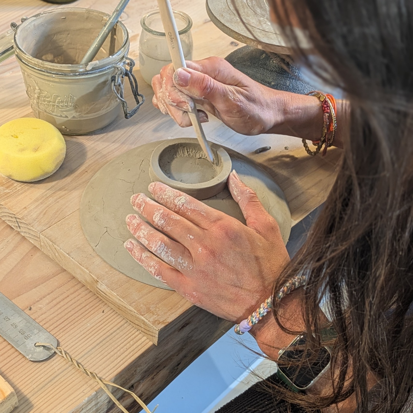 Alice Capestan, fondatrice de Capestan les Ateliers, s’est donnée pour mission de transmettre les techniques de façonnage (au tour de potier) et de modelage (plaque, bol pincé, colombin, estampage).