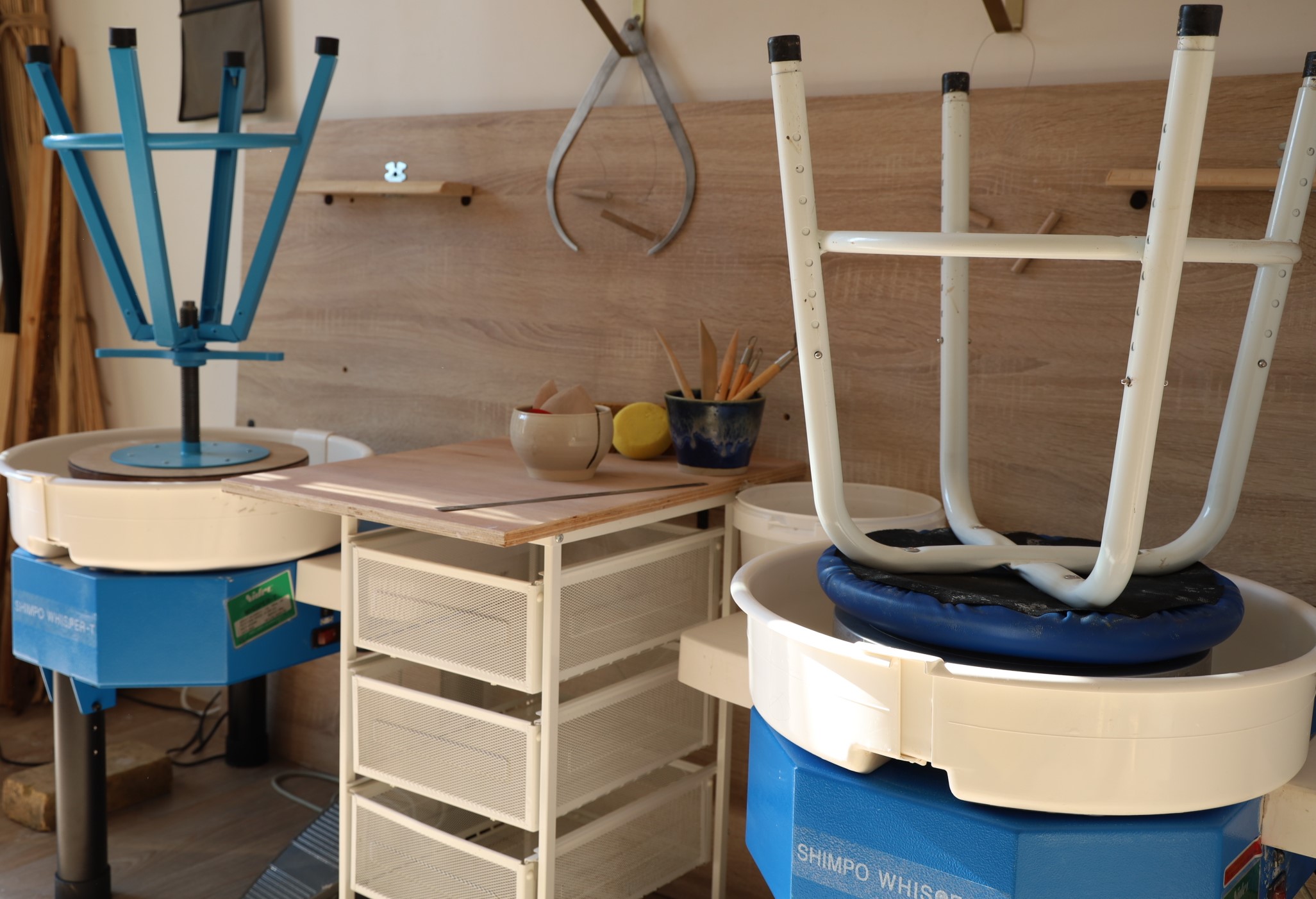 Les stages et les cours hebdomadaires se déroulent dans un atelier, intimiste et lumineux, bordé par une terrasse en pierre en lisière d’un charmant jardin. Il comprend notamment deux tours de potier, un grand établi en bois de deux mètres de long et un panel varié d’outils de qualité, permettant de travailler dans le confort, la sérénité et la bonne humeur.