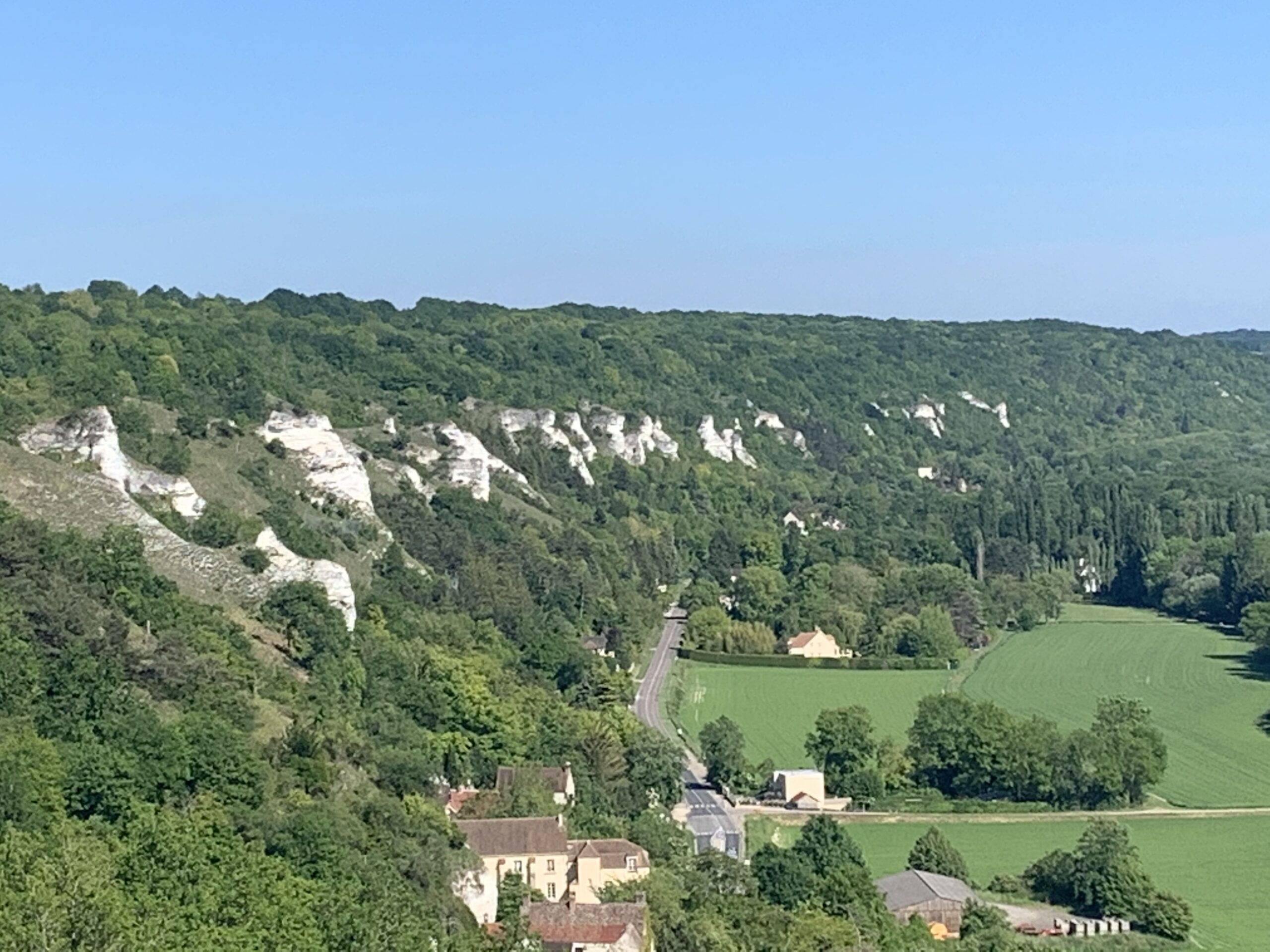 Depuis les bords de Seine à Vétheuil, vous grimperez directement sur les hauteurs du village. Passées les dernière maisons du village rendu célèbre par Claude Monet, vous pénétrerez dans la réserve naturelle nationale des Coteaux de la Seine en empruntant le chemin de Chérence. En quelques dizaines de mètres, vous passerez de 12 m d'altitude au niveau du fleuve à près de 130 m d'altitude : une bonne mise en jambe avant de profiter d'un replat le long de l'aérodrome de Chérence et de profiter des vues offertes sur les pinacles crayeux de Haute-Isle. Entre Haute-Isle et La Roche-Guyon, le relief se refait plus accidenté, vous enchainerez à couvert montées et descentes à travers les coteaux, le temps que se dessine à l'horizon la silhouette majestueuse du donjon de La Roche-Guyon. Puis vient la descente dans le village de La Roche-Guyon, l'un des plus beaux villages de France, son église, son château, sa halle et son potager-fruitier (et ses commerces et restaurants pour une pause bien méritée) avant de reprendre l'ascension des coteaux par la vieille charrière de Gasny en direction de Gommecourt. Peu après l'aire de stationnement aménagée du Val Raux, sur un promontoire, une table d'orientation vous permet d'embrasser d'un seul coup d'œil tout le parcours effectué !