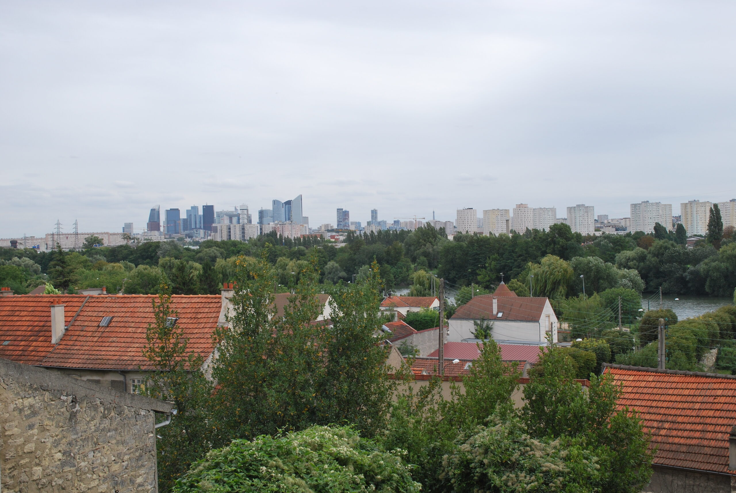 Continuez tout droit jusqu’à la rue Maurice Berteaux. Bifurquez à droite au niveau de salle des fêtes puis traversez le parking situé au bout de la rue Félix Ballet. Suivez ensuite la bande cyclable, elle vous mène à un belvédère donnant sur l’A14 et les tours de la Défense.