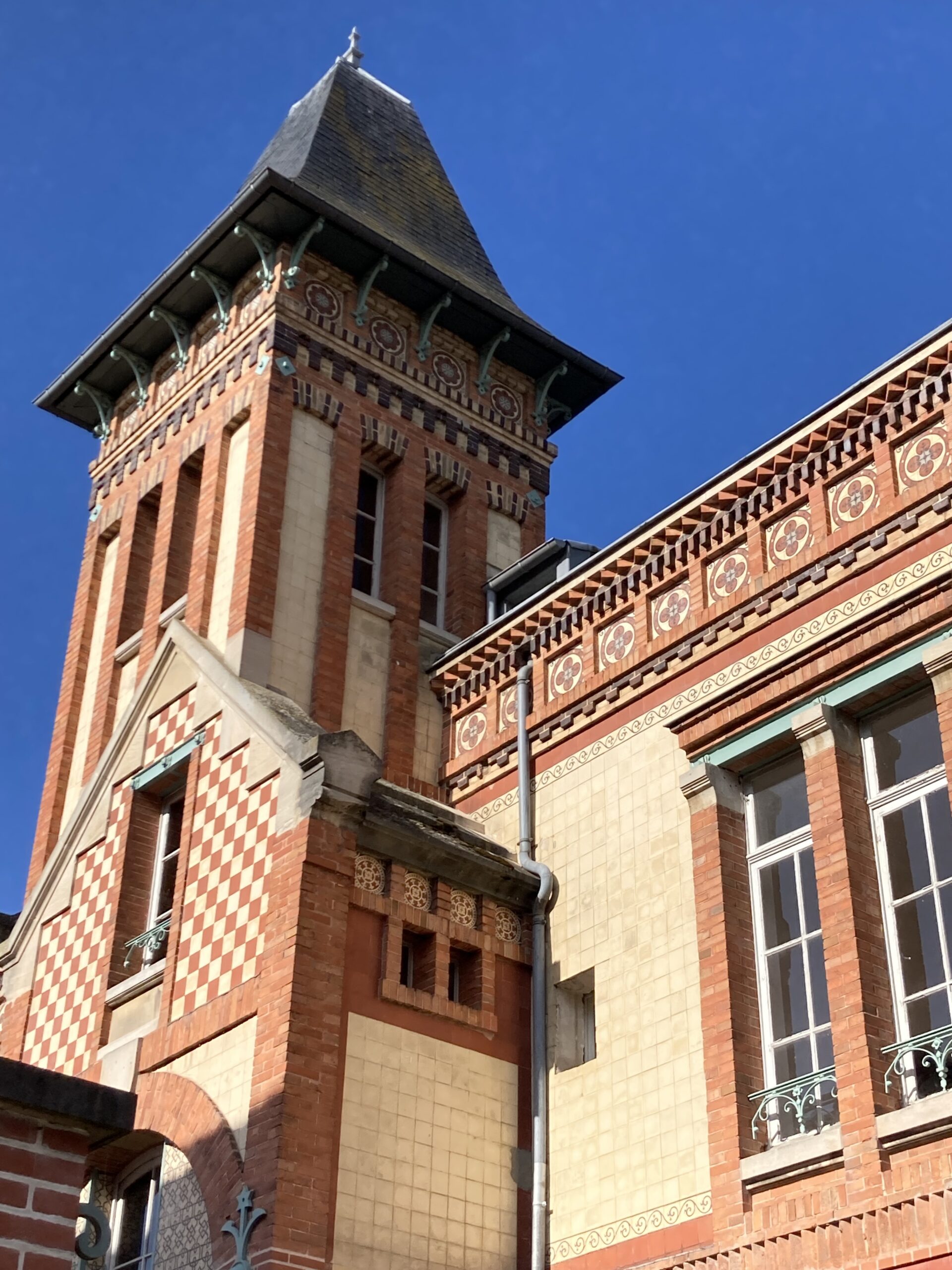 Puis, une demeure datée, de la fin du XIXè siècle, se dresse devant vous, il s’agit de la Martinière, bâtisse emblématique de la ville, elle témoigne de ces grandes demeures du XIXème siècle, son style amorce le passage entre l’éclectisme et l’art nouveau. Ses architectures et matériaux utilisés pour sa construction ne vous laisseront pas indifférent, remarquez les briques d’une part, les céramiques et le fer d’autre part, un décor végétal vous guide vers un grand parc avec terrains de sports et jeux pour les plus jeunes. Prenez le temps de bien observer tous les détails de cette demeure.