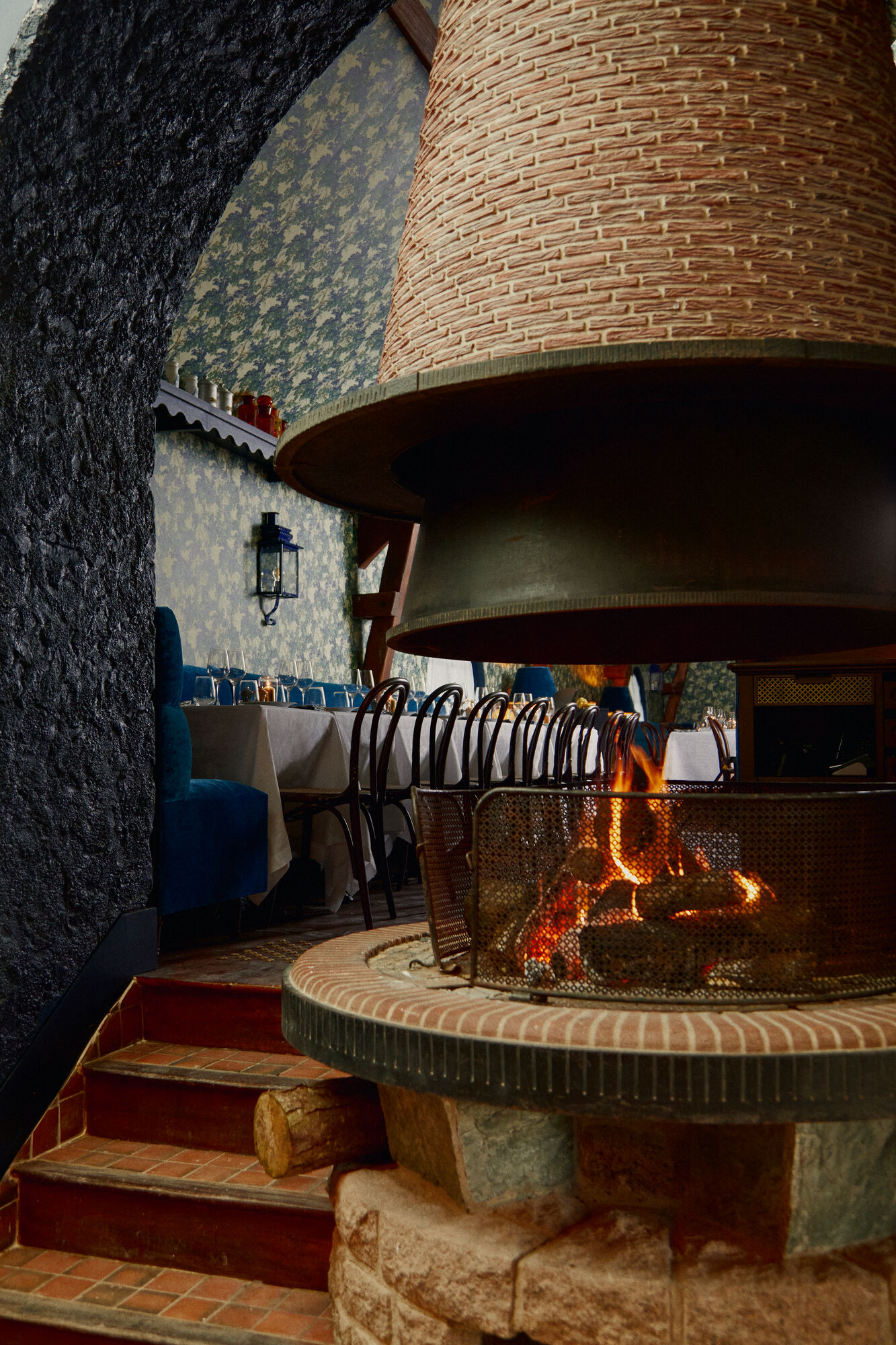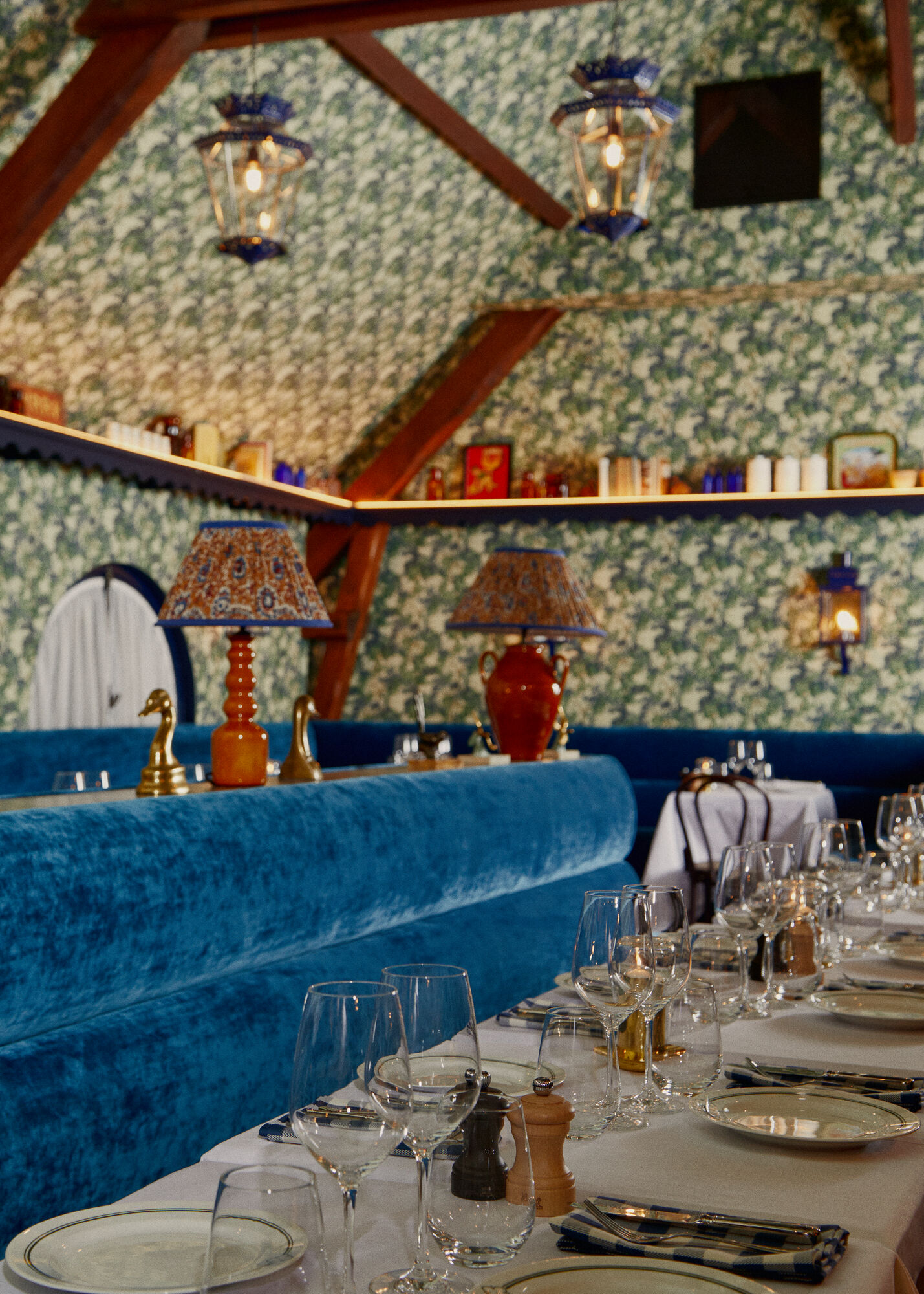 Sous les toits en pente de la vieille bâtisse, la charpente joue avec la tapisserie champêtre une partition agreste et chaleureuse, tandis que l’été venu, c’est à l’ombre du grand saule pleureur surplombant l’étang que l’on dégustera cette cuisine réconfortante. A la nuit tombée, les guirlandes s’illuminent sous les branches et le pianiste joue ses premières notes, accompagnant les discussions endiablées et les rires des grandes tablées.
