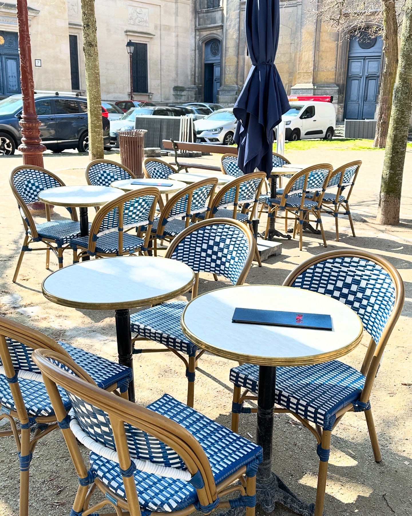 Aux beaux jours, profitez de notre terrasse ensoleillée avec vue sur la cathédrale Saint-Louis, un cadre idéal pour savourer un repas au grand air.