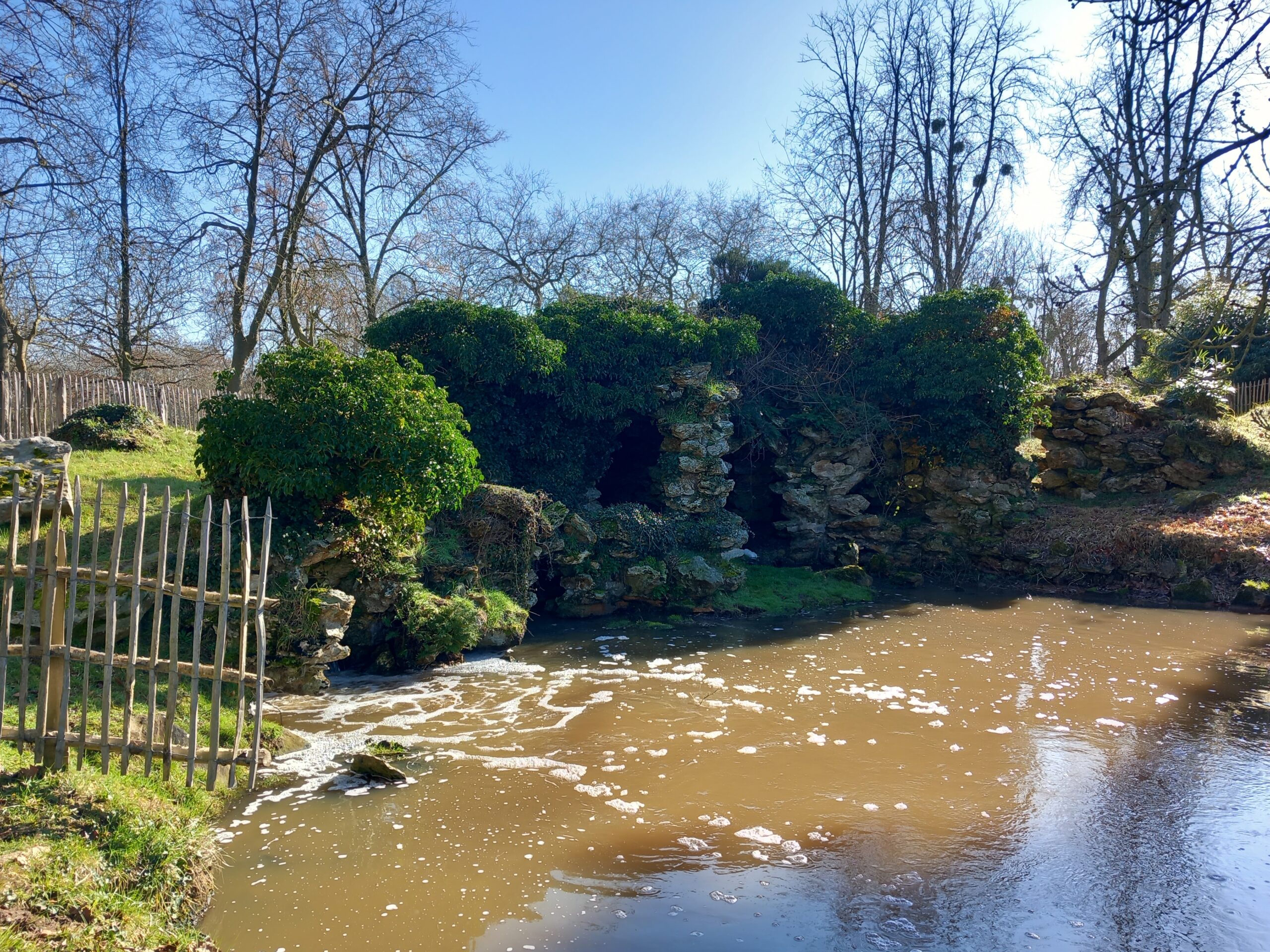 Surmonté d’un pavillon chinois, disparu depuis comme la plupart de ces fragiles constructions de bois appelées fabriques, cette rocaille fut appelée « grotte des amants » à la fin du XIXe siècle, à la suite, paraît-il, de la mort d’un couple de jeunes promeneurs qui s’y seraient réfugiés pendant un orage, et y auraient trouvé la mort à cause de la foudre.