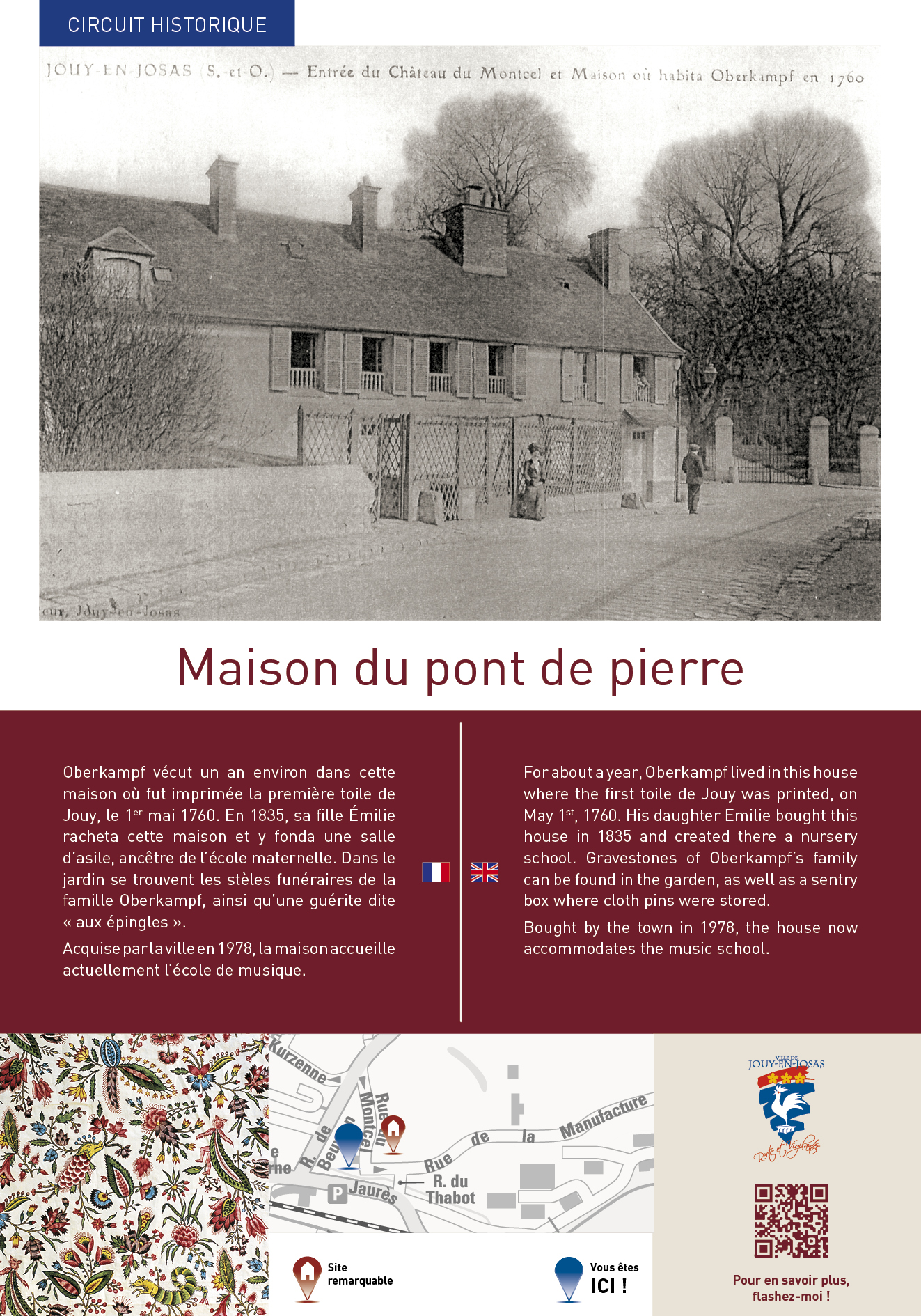 Christophe-Philippe Oberkampf vécut environ 1 an dans cette maison, où fut imprimée la première toile de Jouy, le 1er mai 1760. Dans le jardin, se trouvent les stèles funéraires de la famille Oberkampf, ainsi qu'une guérite dite "aux épingles".